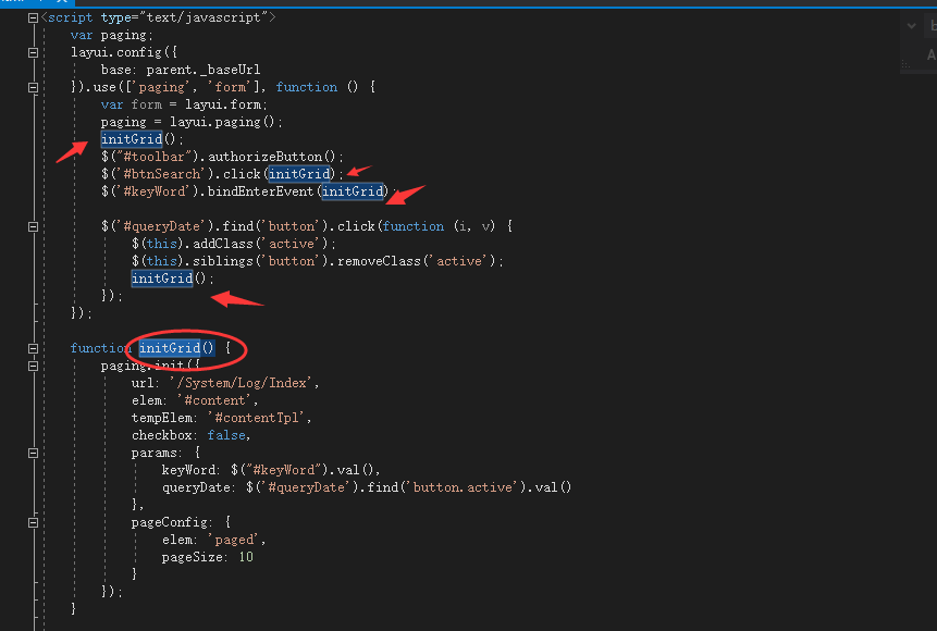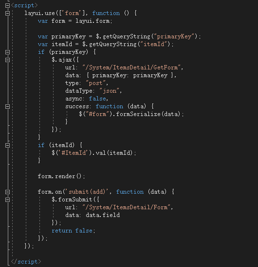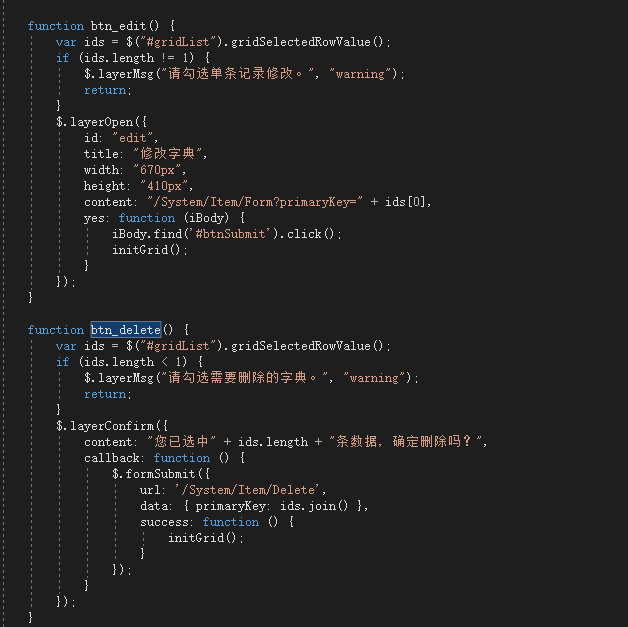 2. 关于使用 。 大家可以对照layui的官方文档去了解下面的这些代码是如何使用的。 主要有表单提交、内容模板、ajax, js方法事件,弹框等等