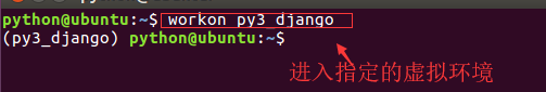 - 使用虚拟环境的命令 : workon 虚拟环境名称 例 :使用py3_django的虚拟环境 workon py3_django