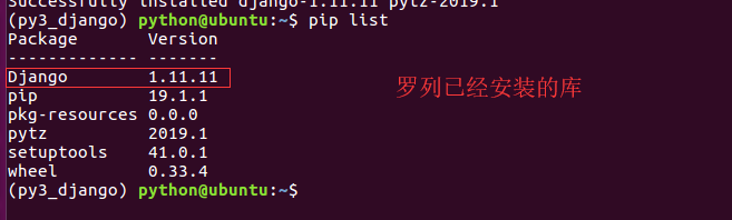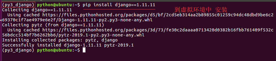 - python3版本下安装django-1.11.11的包 : pip install 包名称 例 : 安装django-1.11.11的包 pip install django==1.11.11