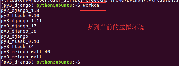 - 查看虚拟环境的命令 : workon