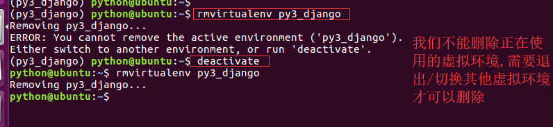- 删除虚拟环境的命令 : rmvirtualenv 虚拟环境名称 例 :删除虚拟环境py3_django 先退出:deactivate 再删除:rmvirtualenv py3_django