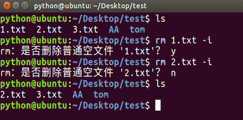 - rm 表示删除文件或者目录,如果删除目录需要使用 -r 选项,-r 表示递归删除目录及其内容