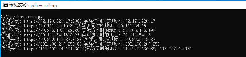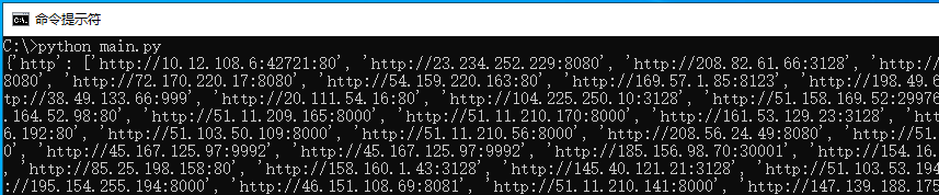 CheckProxy(proxy_list)代码验证原理则是通过调用requests.get函数访问http://httpbin.org/get当代理地址与当前地址一致则说明该地址是可用的,通过循环的方式不断验证即可得到一批可用地址,如下图所示;