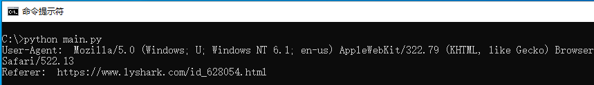 print("Referer: ",ref.get("Referer"))如下输出效果,我们通过传入一个参数,即可输出一条随机请求头,及一个来源地址,输出效果如下所示;