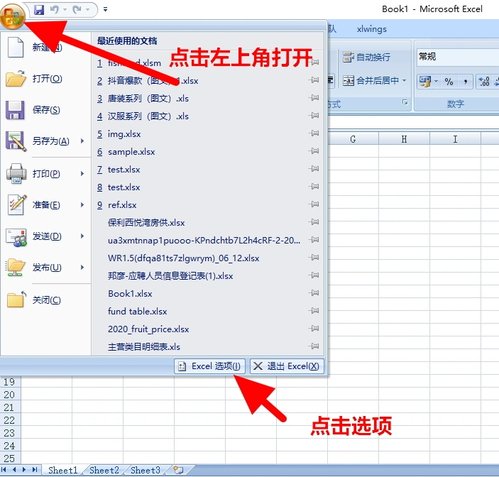 打开 excel,先点击左上角的圆圈,弹出菜单,然后点击底部的 Excel 选项