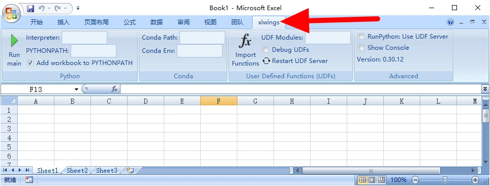 返回到 excel 工作区,可以看到工具栏顶部多了 xlwings 一栏