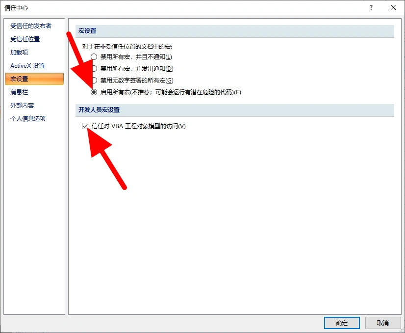 到此虽然可以看到工具 xlwings 了,但是由于一些 excel 的默认安全策略所致,xlwings 这类宏还不能正常工作发挥作用,还需要去到信任中心启用宏设置