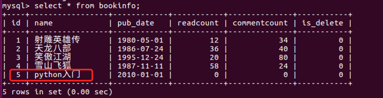 insert into bookinfo(name, pub_date, readcount,commentcount, is_delete) values