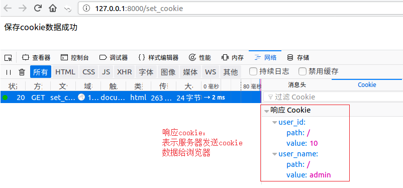 - 在响应请求时,服务器会把生成 Cookie 数据 发给浏览器,浏览器会自动保存 (前提:浏览器开启了cookie功能)